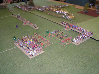 Game ended on a 7-3 victory for me when time was called. I had taken out most of the mounted they had in the centre by this time and had punch through his left flank after destroying his light horse so I could have reasonably expected to have rolled up his left flank command within another couple of bounds and probably broken his army. I felt that John had taken far too much mounted Reg Bw X and his wasn't in a position to make any use of it in this game. This army is on my possible to buy list for next year as a new army painting project but I am still thinking about it. John had strong winds blowing into his face all during the game which reduced his effectiveness of the bow fire on the few times he managed to get in range.